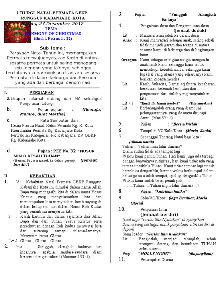 Tertib Acara Natal Sekolah Minggu Doc Acara Natal Sekolah Minggu Hkbp Tridarma Ressort Kebayoran Jakarta Mita Tampubolon Academia Edu Tertib Acara Perayaan Natal Osis Sman 8 Medan Jumat 13 Desember from www.coursehero.com Prosesi i've heard there was a. Rundown acara natal sekolah minggu dan remaja hkbp sidoarjo 16 desember 2017 n o acara keterangan durasi pic time keeper 1 prosesi team perkusi masuk dengan lagu hai mari berhimpun kj 109 hai mari berhimpun dan bersukaria. Keluarga besar sma negeri 8 medan jumat, 13 desember 2019 i. Kasih persaudaraan yang tulus ikhlas (1 pet 1:22) tertib acara perayaan natal. Lihat ide lainnya tentang sekolah minggu, sekolah, natal. Tata ibadah perayaan natal pemuda. Sore itu aku habis senam seperti biasanya. Alam raya berkumandang oleh pujian mulia senin, 19 desember 2016 dari gunung dari padang,kidung malaikat bergema.